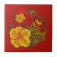 Beautiful fine art floral painting of primula in red yellow and green hues. Printed for a original watercolor and gouache painting on dark paper by Sarah Trett.