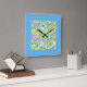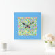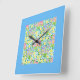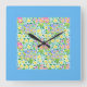 A pretty, square Wall Clock with a pattern of deep pink, deep blue and yellow primroses and a turquoise border, from a handpainted watercolour design by Judy Adamson.