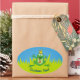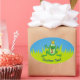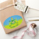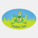 Prince frog cartoon with crown over green grass under blue sky. Custom text.