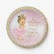 Princess baby shower paper plates with adorable little baby princess wearing a pretty pink tutu and string of pearls on a pink and gold background. These cute ballerina princess baby shower paper plates can be customised with text in the font style and colour of your choice.