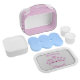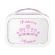 This cute lunch box features a pink girly crown with hearts on a white background. The pink script text can easily be personalised with a name, other text or removed.