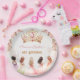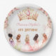 Princess Birthday party paper plates adorned with a pink and gold crown, delicate flowers, and adorable little princesses in pastel dresses. Easily personalise the text. Perfect for any Birthday of a little girl. - Kate Eden Art