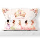 Princess Lumbar pillow adorned with a pink and golden crown, delicate flowers, and adorable little princesses in pastel dresses. The name, roses and crown on the back side. Easily personalise the text. - Kate Eden Art