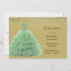 Surprise all your guests with this magical, emerald green and gold design for the sweet fifteen honoree. Diamond glitz overlay on the dress top, and glitter scatter in corners, under string lights on golden background.