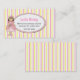 Sweet girl's play date calling card, done in a pink, yellow, and white striped pattern background. A white oval text area, in the middle, is decorated with a pink rim and cute country graphics, of a little girl Princess, holding a frog. Personalise the text for yourself, as a mummy card, or for your child. Great way to stay in touch with other moms and arrange play dates, birthday parties, and baby sitting co-ops.