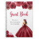 This quinceanera guest book features a beautiful princess in a burgundy red ball gown with floral arrangements. This is perfect for a quinceanera birthday party.