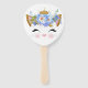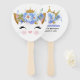 Cute birthday party fan, with graphics of a kitty's face with big eye lashes, golden ears and crown and blue flowers on it's head. The back has graphics of a larger gold crown with blue flowers and custom text ready to personalise for your event.