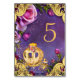 Princess table cards with fancy gold princess carriage on a beautiful purple and gold background. You can customise these purple and gold princess table cards with numbers in the font style and colour you prefer.