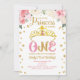 This princess-themed first birthday invitation template features elegant gold glitter text, a royal tiara illustration, and beautiful floral accents. Perfect for celebrating a little one's special day in style!