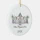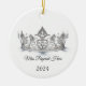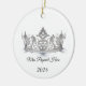 This ceramic ornament is shown in a round shape with a sparkling silver crystal tiara with black text on a white background.