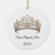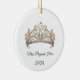This ceramic ornament is shown in a round shape with a sparkling crystal tiara with black text on a white background.