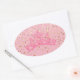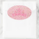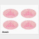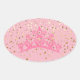 Oval sticker shown with a Pink tiara overlay upon Golden stars print. Pink background.