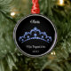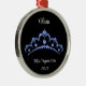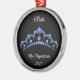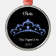 This tree ornament is shown in a round shape with a sparkling pretty faux diamond tiara print in blue, shown with red ribbon and silver rimmed.