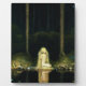 Princess Tuvstarr with long, blonde, wavy hair sitting in the forest, looking down at her reflection in the dark waters. Beautiful watercolor by John Bauer. Illustration for the Swedish folktale "The story of Skutt the moose and little Princess Tuvstarr", written by Helge Kjellin in 1913.