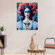 An image of a princess with blue feather dress. This is an AI generated artwork with a floral theme.