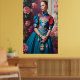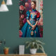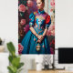 An image of a princess with blue decorative dress and silver crown. This is an AI generated artwork with a floral theme.