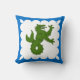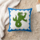 "Argent, a sea-wolf contourny vert, a bordure engrailed azure." Populace badge for the Principality of the Mists in the Society for Creative Anachronism. Back of pillow is a mediaeval pattern in coordinating colours.