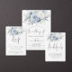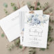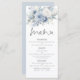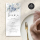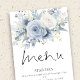 Printable Dusty Blue Florals Wedding Menu. Available digitally and printed. An informal set typography in black for the main heading Menu complementing the rest of the text which you can easily personalise, with beautiful autumn coloured flowers and grasses at the top.