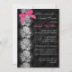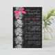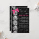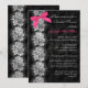 This elegant and sophisticated bridal or wedding shower invitation has a tone on tone black and grey floral pattern background with a silvery white faux textured lace design on it and a hot fuchsia pink PRINTED ON bow that would be perfect for a lingerie shower. The text and paper is all customisable. It is shown here on basic paper. I would NOT use metallic gold, or silver paper as they will both severely darken/alter the colour of the card. ***PLEASE NOTE that if you change the font or size of the font, it may alter how your invitation prints. It will print the way you see it on your monitor, so if you have alignment issues, or sizing problems, please contact me for help before you order. I will not see your invitation once you order it, and Zazzle will NOT edit anything (typos, alignment, etc.). If you require assistance or would like any other matching items, please email your request to niteowlstudio@gmail.com.