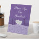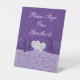 This romantically elegant two-toned purple and white floral wedding sign has a PRINTED purple ribbon and bow with a pair of PRINTED diamond jewel and FAUX silver glitter (simulated) joined hearts on it that has customisable wording. ***PLEASE NOTE there are no raised elements on this card. Everything is printed flat. ***PLEASE NOTE that if you change the fonts or size of the fonts, it may alter how your sign prints. It will print the way you see it on your monitor, so if you have alignment issues, or sizing problems, please contact me for help. I will not see your your order and Zazzle will NOT edit anything (typos, alignment, etc.). If you require assistance or would like any other matching items, please email your request to niteowlstudio@gmail.com.