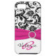 Monogrammed modern pink, black, and white floral damask Case-Mate Vibe™ iPhone 5 Case with a hot pink PRINTED ribbon and PRINTED jewel buckle on it.