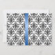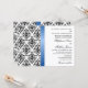 © 2013 Socialite Designs. Our black and white damask wedding invitation has a faux royal blue satin ribbon. All design elements and text are customisable. If you require additional matching wedding products such as save-the-date or thank you photo cards, please do not hesitate to contact Socialite Designs. PLEASE NOTE THAT THE RIBBON IMAGE IS PRINTED ONTO THE INVITATION.