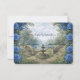 Set the tone for your happily ever after with this fine art stationery suite. Perfect for couples planning a romantic estate or destination garden celebration.This design features a symmetrical, hand-painted illustration style depicting a grand stone staircase leading towards a central water fountain. In the distance, a subtle silhouette of a fairytale castle sits against a soft sky with light clouds. The scene is framed by lush borders of sage green and olive leaves, accented by soft pastel blue roses. The background simulates a muted cream and aged parchment hue, providing a vintage canvas for the elegant cursive script and classic serif typography.