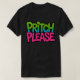 This t-shirt design features the playful phrase "PRITCH PLEASE" in a bold, colourful font. The text is split into two colours—green for "PRITCH" and pink for "PLEASE"—creating a vibrant contrast against the black fabric. The overall aesthetic is casual and humourous, making it a fun statement piece.