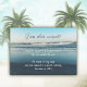 Announce that you are married with beach scene cards. Customise text in two places over a blue ocean background image. Text at top has many options such as, “Guess who’s married?”, “We tied the knot”, or “We are Mr. & Mrs.” At the bottom, white, printed text holds all the information about the private ceremony. Reverse is solid dark blue.