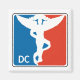 White silhouette of chiropractic caduceus on a blue and red "pro" background. White "DC" appears to the right of the image.