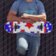 Best skateboarding decks in the world! Customise the style and size you like using this design. This is the red, white, & blue themed deck. Order completes or just the deck alone! This is the 7-ply maple Ca USA made deck which is top of the line quality. Order professional sized decks or the mini pro. Also available is the Old School style. Have fun shredding.