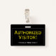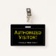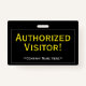 This professional badge design features the message "Authorised Visitor!", and a customisable company name or other custom message. It also features a single-line border. A badge like this could maybe be used to show that somebody at a business or workplace is an authorised guest or visitor. [~Z0000307]