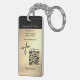 This promotional keychain offers a professional, elegant, and trendy first impression. It’s composed as described below: Front: Black logo on a gold background featuring a bearded man with wavy hair, followed by your company/personal name and the shop type (default: barber shop). Back: Slogan, full contact details, a QR code for easy website access and a small drawing representing professional hair scissors.