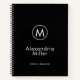 Modern notebook features a minimal design in classic black and white. Custom name and title presented in stylish simple font with a complimentary minimal monogram medallion.