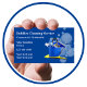 Cleaning service business card design template for residential or commercial and janitorial services. Created with a bubbles graphic and cleaning supplies bucket filled with cleaning supplies.