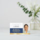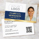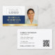 Make a great first impression with these stylish personalised business cards! An elegant template with your ID photo, name, job title, company logo, contact information, and a scannable QR code. All of the text can be customised or deleted to suit your business needs. This adaptable design would suit many different professions, including corporate employees, real estate agents, notary public, loan signing representatives, small enterprises, and more! Printed colours: dark blue navy and white with a gold gradient.