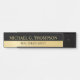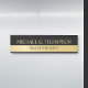 Professional Elegant Black and Gold Door Sign featuring name in gold serif font style, with profession in black serif font style on gold bottom border, on black background.