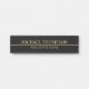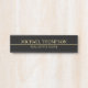 This hanging name plate features name and title in gold professional serif font style with gold line in the middle on black background.