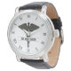 Men's medical watch featuring elegant clean black caduceus. Perfect for any business company related to healthcare industry: medical practice, medical office, doctor office, pharmaceutical industry, drugstore, clinic and hospital. For hospital staff, clinic employees, physicians, registered nurses; classy, noble, elegant and precious.