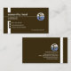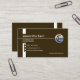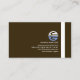 A dark brown cover is accentuated by two sets of white demarcation lines. The top thin line houses your prestigious name, job title and business name. A global logo for you to use, is located at the end of the thin line. The vertical column line on the left has triangle buttons that hold on to the contact details. Towards the lower right corner is a slogan caption to publicize your services.