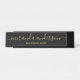This desk name plate features name in gold modern script font style and title in gold modern sans serif font style on black background.