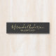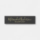 This hanging name plate features name in modern script font style and title in gold modern sans serif font style on black background.