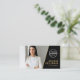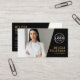 This modern business card features a black background on both sides with a mix of white and gold fonts for a clean, polished look. Gold line accents add a touch of sophistication, keeping the design sharp and professional. The front includes your photo, logo, name, and title for a personalized layout. The back displays your contact details, a scannable QR code, and social media icons with a simple “Connect with us!” message. Fully customizable and easy to match to any brand style.