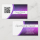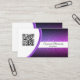 A faux purple glitter sets off the background of this business card design featuring template name and title on the right with QR Code placeholder on the left side. The back includes a coordinated colour design with text fields for the business name and details. Replace the placeholder with your QR code on the front. Fill in the template fields or click customise to select a font style, size, and colour you like. Use the QR code link to send customers to your website, reviews, photos or other special page.