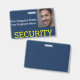 This custom identification badge features a "SECURITY" title printed in yellow across the bottom portion over a blue background. A sample security guard photo is placed on the right which you can personalise to include your own photo ID. The company name and employee name are printed to the left of the picture.