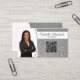 A faux silver glitter sets off the background of this business card design featuring a photo placeholder on the left with template name on the right. The back includes a coordinated design and colours with text fields for the business name and details. Replace the placeholder photo with your vertical format photograph and your QR code on the front. Fill in the template fields or click customise to select a font style, size, and colour you like.The placeholder photo is courtesy pixabay.com.