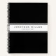 Modern notebook features a simple black and white design with custom name in a coordinating white banner with a complimentary grey stripe with black accents and text.