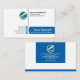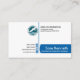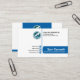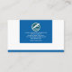 A simple design with your name and job title in a blue column near the base of the card. Directly across are your contact details, each assigned to their respective blue bullet points. Northwards, you can see your optional logo with the business name and address beside it. A thin blue line from the card's roof, demarcates these two items, stretching up to the card's base.