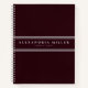 Modern notebook features a simple design in a burgundy and grey colour palette. Custom name presented in a burgundy banner with a double grey stripe with light grey accents and text.