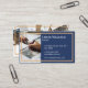 The front side highlights your name, title, and contact details on a clean blue background accented with a fine gold frame, ensuring readability and elegance. The back side features a realistic desk photo with your firm’s name and slogan, emphasizing professionalism and attention to detail.